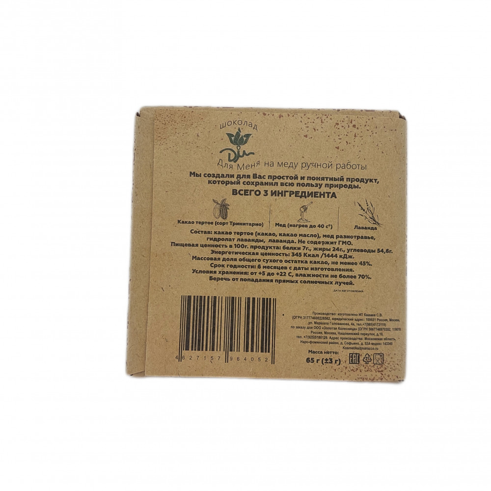Этот полезный шоколад ручной работы имеет в составе всего три ингредиента: Какао тертое сорта Тринитарио, мед разнотравье, гидролат лаванды, полученный из органического сырья.